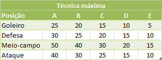 Com o novo simulador alguns atributos, tais como, Velocidade e Técnica, foram adicionados aos jogadores. Estes atributos tem seus valores máximos distribuídos por posição de acordo com a tabela abaixo.